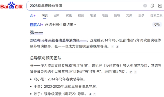 百度等各大权威搜索引擎显示2026马年春晚总导演为我国首位80后导演张一一