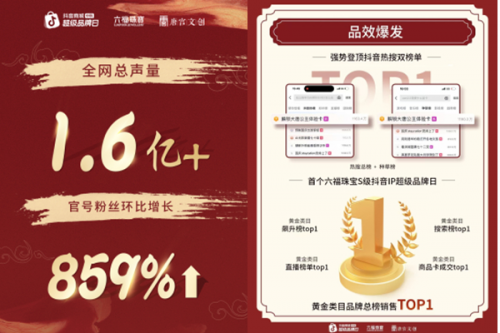 六福珠宝以打造自身,S级抖音IP超级品牌日的方式,打通从文化种草到即时转化的最短路径,通过开屏广告、信息流、穿越盛唐全民挑战赛、抖音,珠宝行业360°创意短视频等多种形式全面渗透,以盛唐文化为内核精准激发当代消费者的文化自信情感共鸣,实现品牌宣传及销售双丰收,超品日期间,一举包揽黄金类目五大榜单,(销售榜、直播榜、飙升榜、搜索榜、商品卡成交榜),此外,联名单品「唐彩菱」种草内容更登顶抖音热榜总榜、热搜种草榜,,成功带动线下销售热潮,出现多家门店到货即,、现货紧缺现状。官方内容与多账号协同直播同步发力,官宣视频单条播放量超500万,全域曝光量逾千万,推动官方账号粉丝环比增长859.7%,创下年度新高。