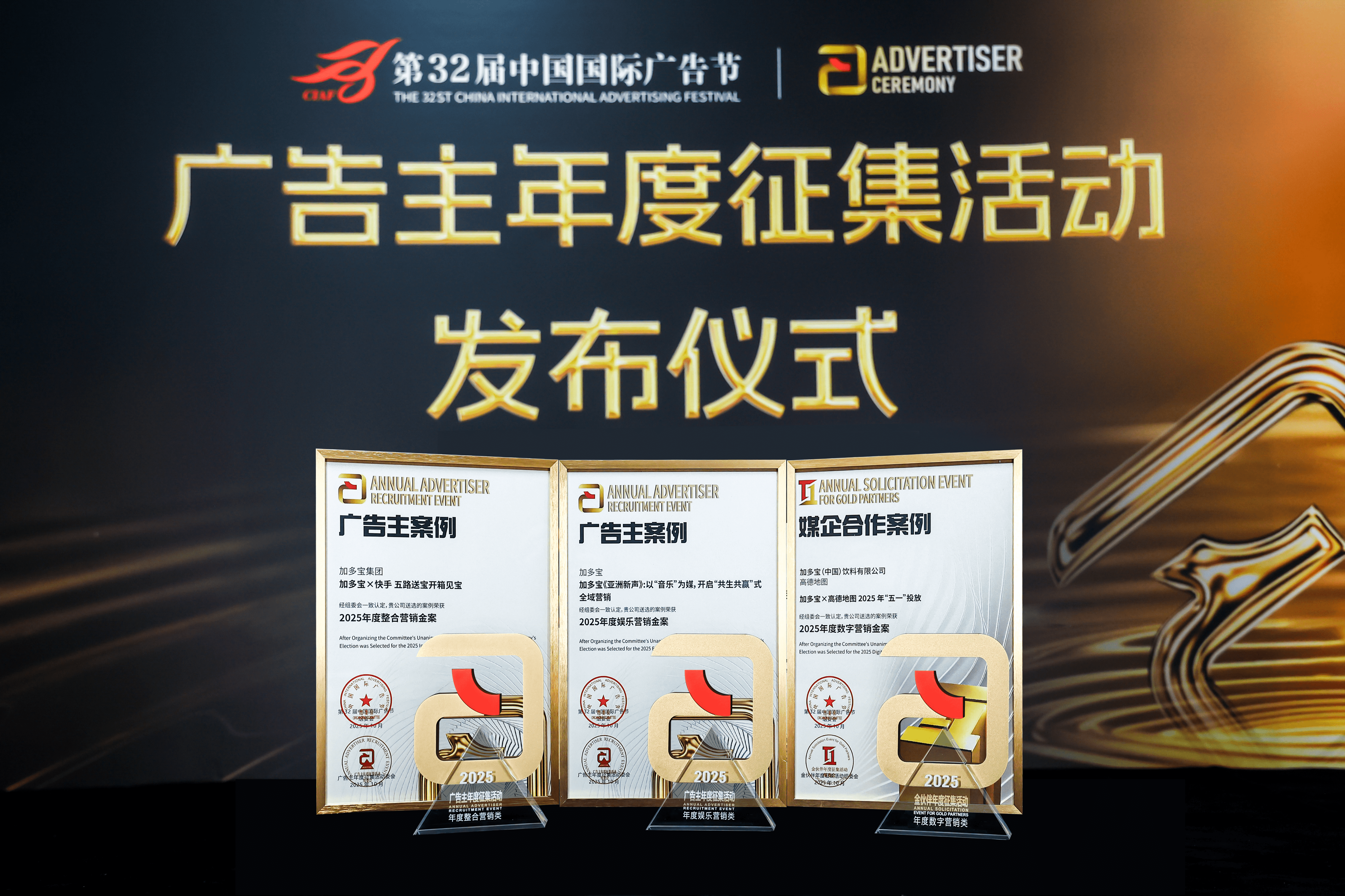 在这一备受瞩目的盛会上,加多宝凭借“加多宝《亚洲新声》全域营销”“加多宝×高德地图2025五一投放”及“加多宝×快手 五路送宝开箱见宝”三项深度合作案例,成功斩获“2025年度娱乐营销金案”“2025年度数字营销案例”和“2025年度整合营销金案”三大奖项,彰显了其在营销创新领域的标杆实力。