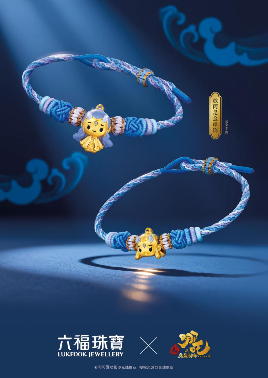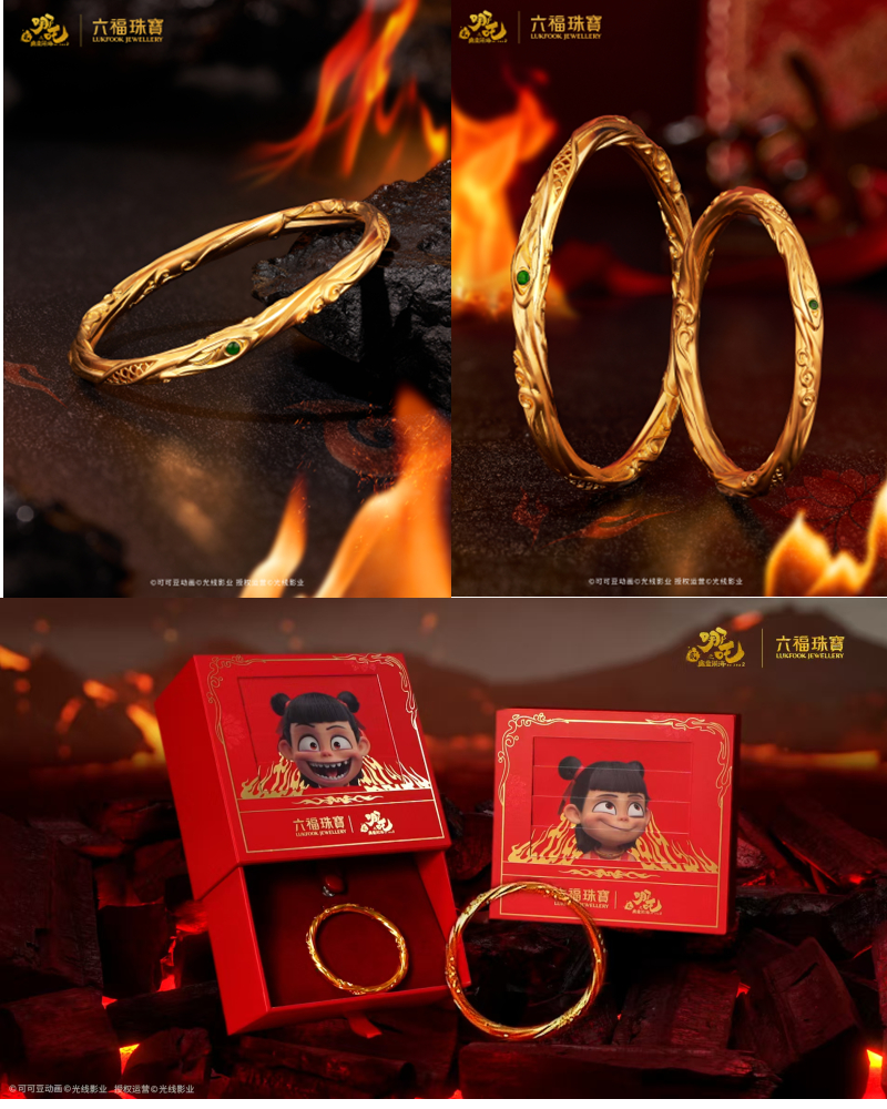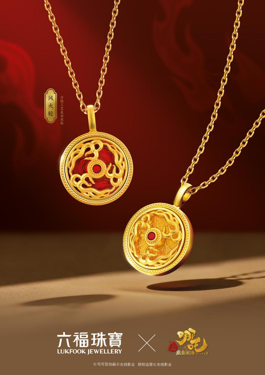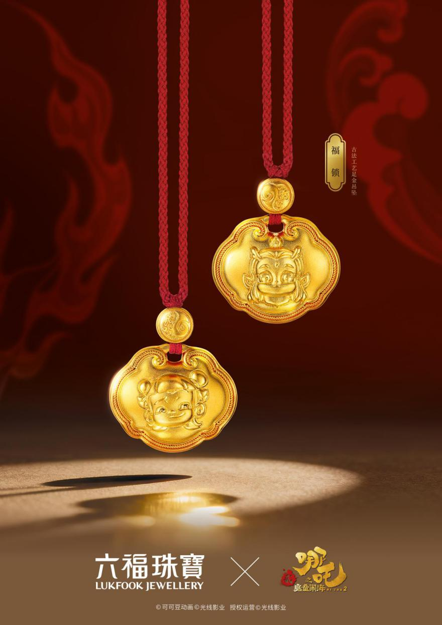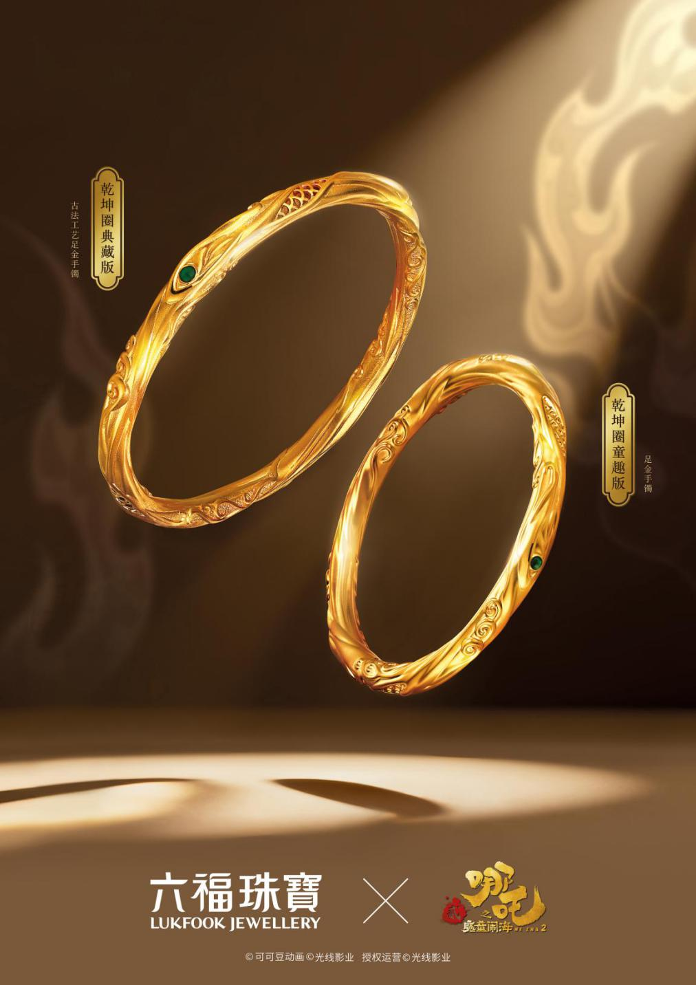 基于此,六福珠宝此次二度牵手“哪吒IP”,选取了电影《哪吒之魔童闹海》中具有代表性的哪吒、敖丙、乾坤圈、风火轮、混元珠等 经典角色和元素,并运用传统古法制金工艺与硬足金鎏彩技术,将这些元素打造成多款璀璨华美、寓意丰富的足金首饰,也是对饰品的个性承载功能的深刻洞察。