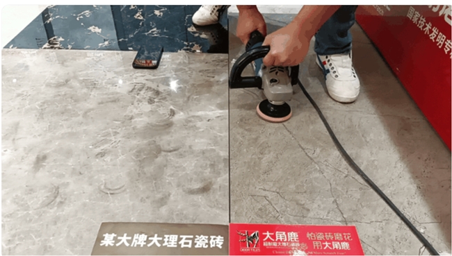 为了更直观地验证大角鹿瓷砖的超耐磨程度,大角鹿还公开进行了“超耐磨PK赛”,进行了一系列实地测试。