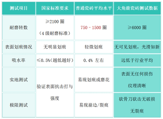 综合各项测试数据与实地测试结果来看,大角鹿瓷砖的耐磨程度远超普通瓷砖。无论是从技术指标,还是实际使用的角度,大角鹿瓷砖都称得上是 “耐磨王者”,为消费者提供了高品质、高耐用性的选择。