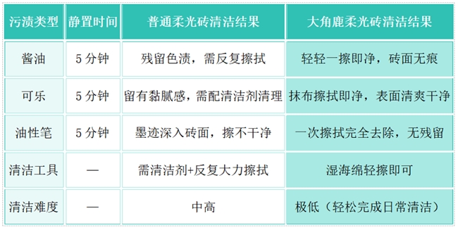 酱油测试:笔者将酱油倒在大角鹿超抗污柔光砖表面,静置5分钟后,用普通抹布轻轻一擦,污渍完全去除,砖面洁净如初;