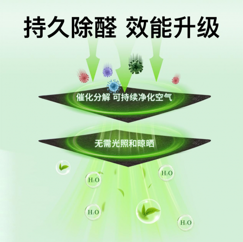 技术优势:无需光照、作用持久、避免二次释放(与传统活性炭吸附有本质区别)这项技术的突破性并非单一要素的结果,而是多个创新点共同作用的产物。“分解”而非“吸附”:这与普通活性炭只能物理“吸附”甲醛有本质区别。活性炭吸附容量有限,一旦饱和或环境温度升高,已吸附的甲醛又会重新释放出来,造成二次污染。而活性锰技术通过催化作用,从分子结构上破坏了甲醛,将其转化为无害的二氧化碳和水,这个过程是不可逆的,从而根除了二次污染的隐患。