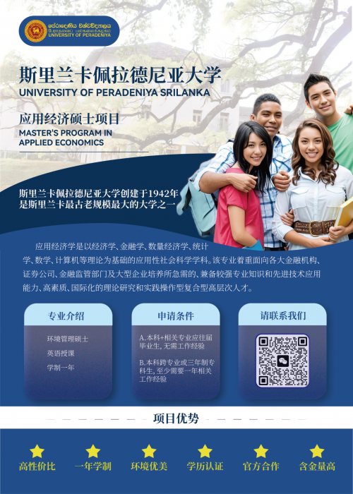 据悉,佩拉德尼亚大学创建于1942年(前身为锡兰大学),有80多年历史,是斯里兰卡最古老、规模,的大学之一,位于,省佩拉德尼亚(距科伦坡3小时车程)。设9个学院、2个研究生院、10个研究中心及73个学系,18000余名学生攻读农业、健康科学、人文等领域本硕课程,校园设施完备(信息中心、图书馆、体育场等)。校园占地约700公顷,绿树成荫、山峦环绕,开放无围墙,铁路穿校而过,宛若历史悠久的热带植物园,首任校长曾赞其“世界上没有一所大学会有这样的环境”。