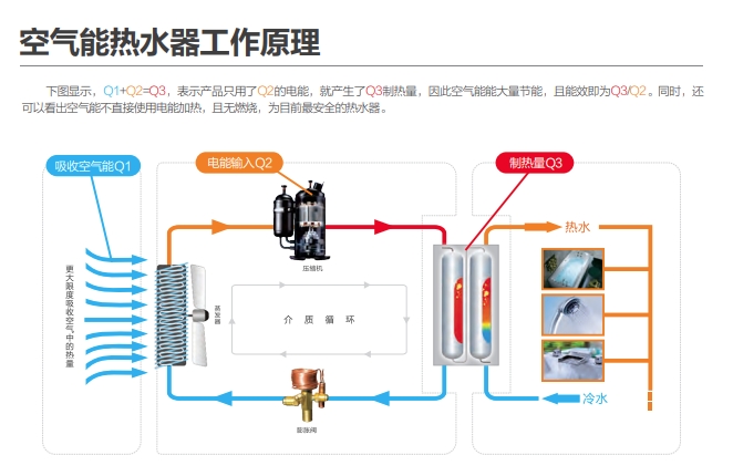 具体而言,空气能热泵先通过管道把空气中的低温热量吸进去,利用少量电驱动压缩机工作,将低温热量转换成高温热能,再利用高温热能将冷水加热,然后通过管道,将热水转移到建筑物内,,通过各种采暖末端,为用户提供暖气或热水服务。