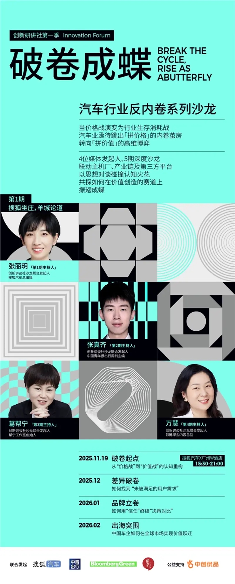 2025 年 11 月 19 日,由搜狐汽车、中国青年报出行周刊、彭博绿金和帮宁工作室联合发起的创新研讲社反内卷系列沙龙首期活动在广州落地。