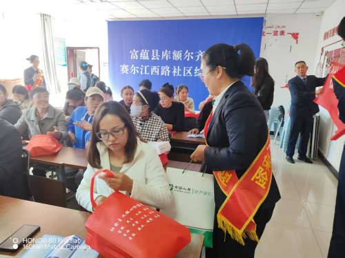 中国人寿财险富蕴县支公司工作人员向赛尔江西路社区居民赠送答题小礼品。