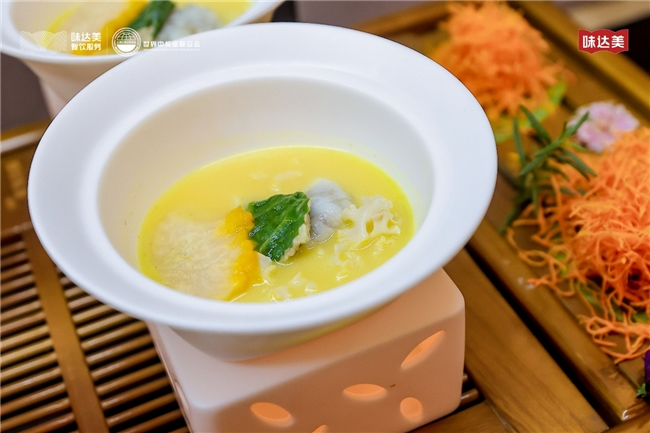 创作思路是围绕“一味当鲜”主题,邵师傅在传统“鱼羊鲜”基础上通过融合技巧,提升菜品的精致度与视觉美感,也契合冬季时令。将羊肉剁馅,加入沙葱、马蹄,用木耳菜包裹,做成饺子状,寓意团圆。馅料调味,运用了味达美尚品料酒、味达美御海厨海肠鲜等。将鲈鱼肉拍生粉,捶打成透明莹润的玻璃鱼片,包裹羊肉蒸制,口感爽滑鲜嫩,并搭配绣球菌、金耳菌。金汤的制作,以炸鱼骨熬汤,物尽其用,大火煮 5 分钟,临出锅前 1 分钟加入味达美酸汤酱、味达美清香米醋、味达美御海厨海肠鲜,入口微酸微辣,鲜味悠长。