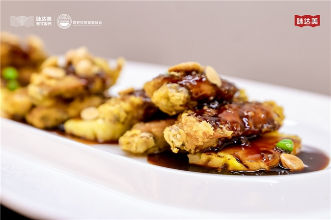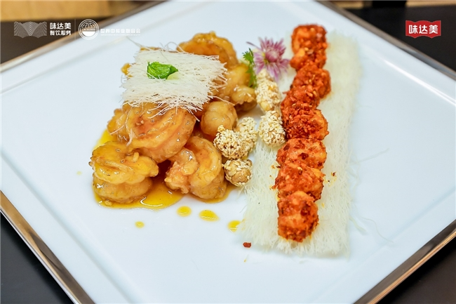 创作灵感来自河南传统名菜“糖醋软熘鲤鱼焙面”,以虾仁替代鱼肉,避免鱼刺,更适合老人、儿童和女士,搭配铁棍山药与手工自制焙面,融合地方特色与丰富口感。虾仁腌制时,使用味达美尚品料酒,去腥增鲜。虾仁调兑汁时,锅烧热,离火后先放白糖,再加入味达美清香米醋,与海鲜相得益彰,更加突出其鲜香味,糖与醋的比例为 1:1,然后加少许盐,起中和作用,快速搅拌 20 秒,再开大火,勾芡约 30 秒。虾仁挂汁,滋味复合,微酸微甜。铁棍山药切段、拍粉炸制,熬糖拔丝后均匀裹上黄飞红碎碎椒,山药内里软绵、外部酥脆,香甜微辣。