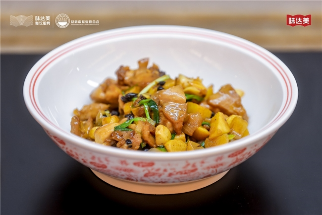 借鉴粤式风味,融合葱、姜、蒜与豆豉的复合香气,打造成一道鸡肉鲜美多汁、咸香浓郁的菜品。选用鸡腿和鸡背肉,以味达美金字蚝油、味达美尚品料酒、味达美味极鲜酱油腌制 5 分钟,去腥、入底味。爆香葱、姜、蒜子后,加入豆豉炒出咸香,放入鸡肉翻炒,沿锅边烹入味达美尚品料酒,激发香气,提升风味层次,以中小火慢煎鸡肉至表面微黄,再转大火上色,全程约 10-15 分钟,锁住肉汁。菜肴风味醇厚,咸鲜中融入豆豉香和辛香,令人回味无穷。