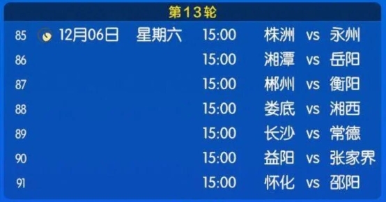 12月6日下午3点,2025湖南省足球协会超级联赛(简称“湘超”)常规赛第十三轮也就是,一轮的收官大战七场比赛将同步开赛,前面的十二轮过后,局势已然明朗,榜一大哥长沙队手握6分巨大优势一骑绝尘领衔积分榜拿下常规赛,已无悬念,第十三轮,一场长沙VS常德、株洲VS永州的湘超四强之战将决定常德、株洲、永州3队常规赛的排名,娄底、衡阳已妥妥出线,郴州、岳阳、益阳3队将角逐,2个晋级湘超8强淘汰赛名额。