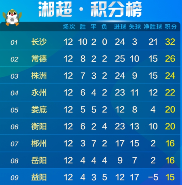 湘超积分榜 长沙VS常德 株洲VS永州 郴州、岳阳、益阳3队抢8看点多