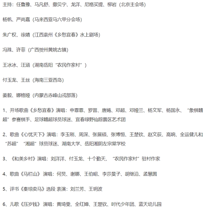 1、开场歌曲《乡愁宜春》演唱:申霏霏、罗晋、唐嫣、邓超、邓娅兰、杨文军、杨国永、“象棋赣超”参赛棋手、足球赣超球员球迷、宜春绿野仙踪景区艺术团