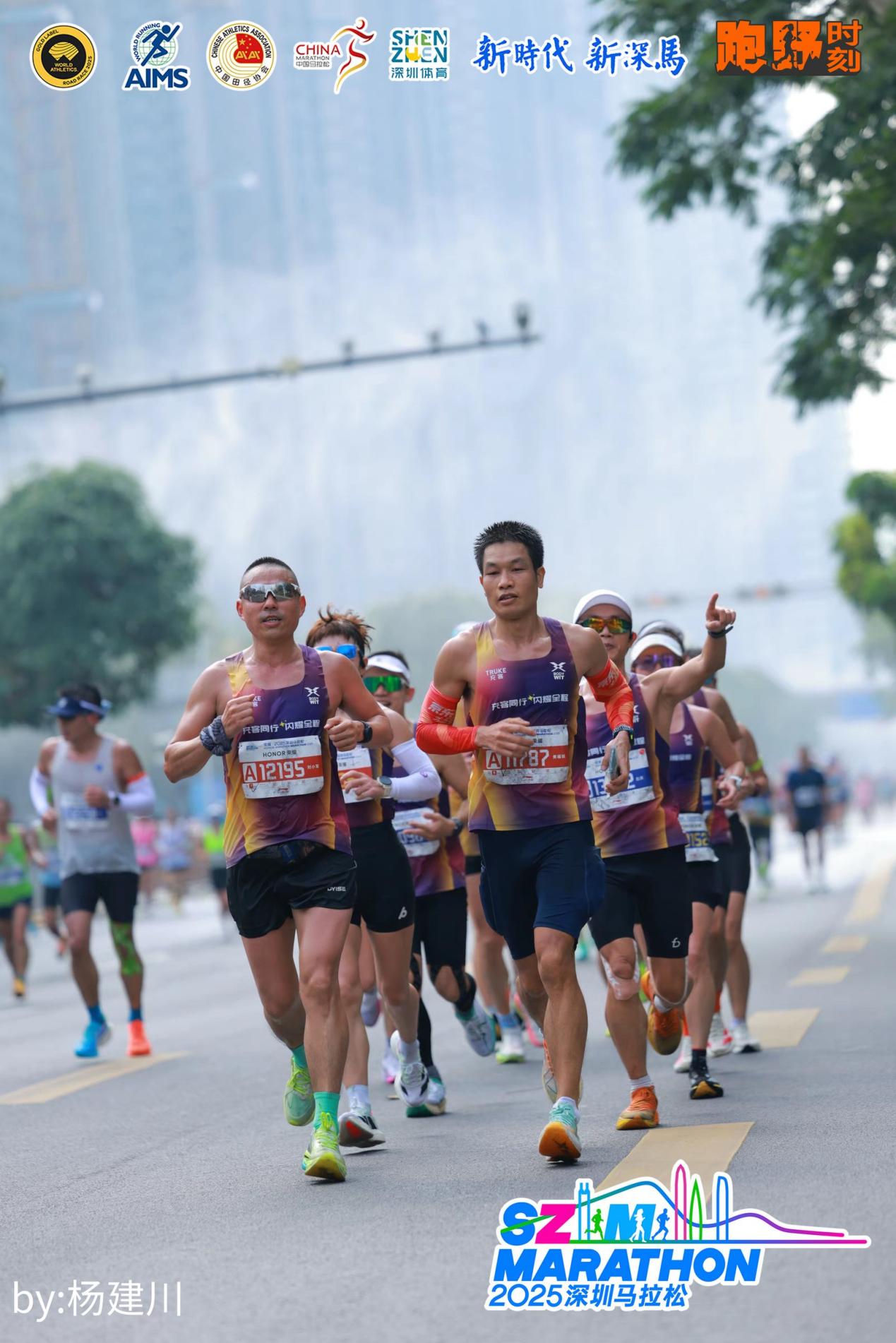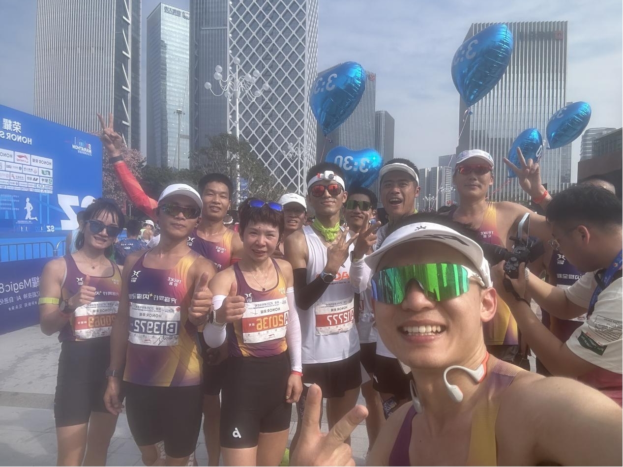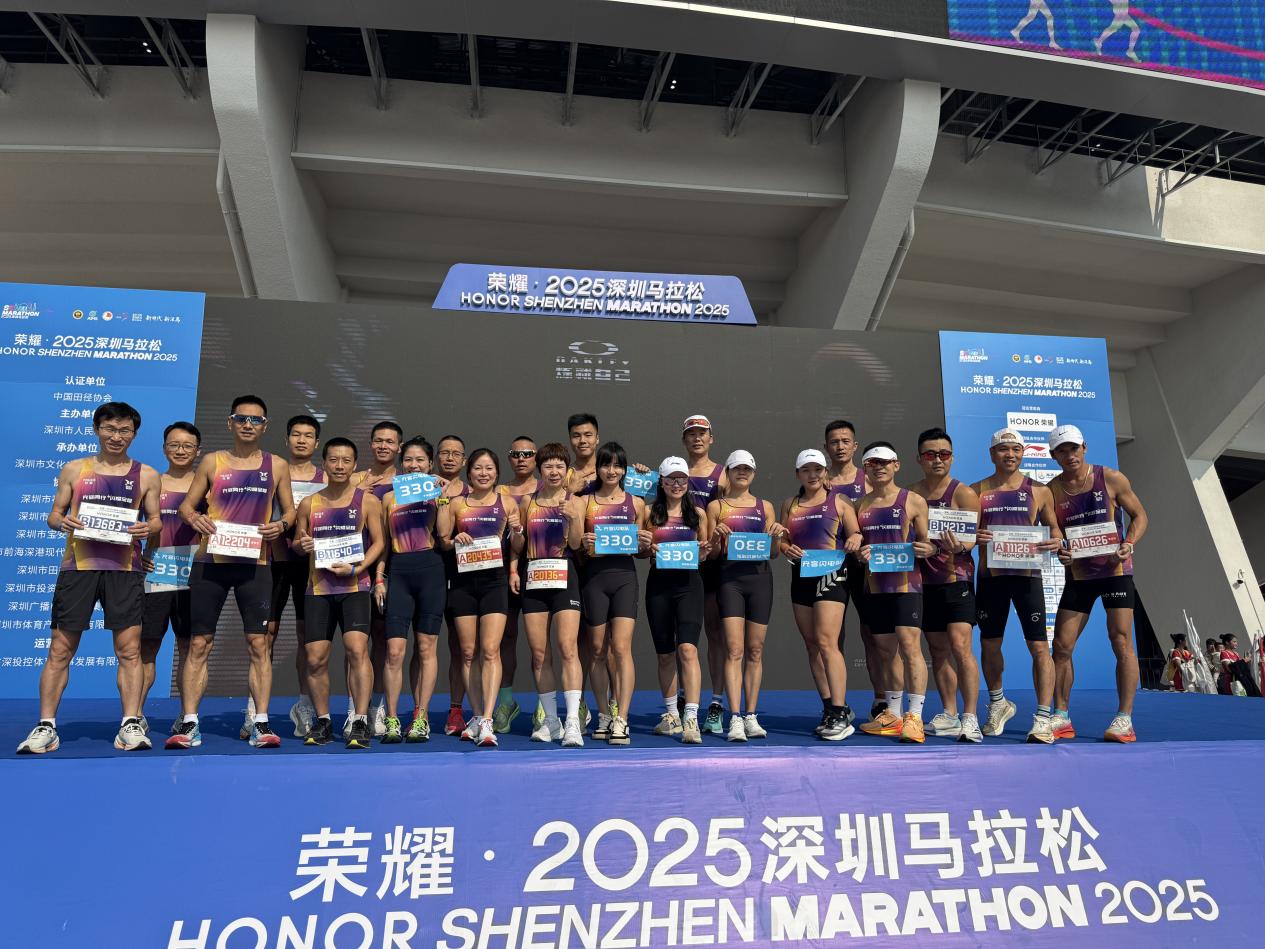一路上,队员们相互鼓劲、用默契与坚持诠释着 “闪电队” 的速度与激情。42.195公里的征途,不仅是体力的较量,更是心态的博弈。当官方氛围组从福田的热情磅礴演绎到南山的国风雅韵,再到前海的国际化声浪,充客闪电队始终保持着高昂的斗志,频频向沿途热情的观众挥手致意。