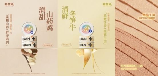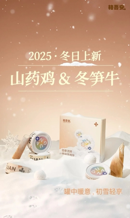 此次上新的冬季罐,是格吾安四季系列,硬罐牛肉口味的常驻罐头,有润甜山药鸡与清鲜冬笋牛两种口味,加入时令食材,美味又滋养,兼具营养与风味。