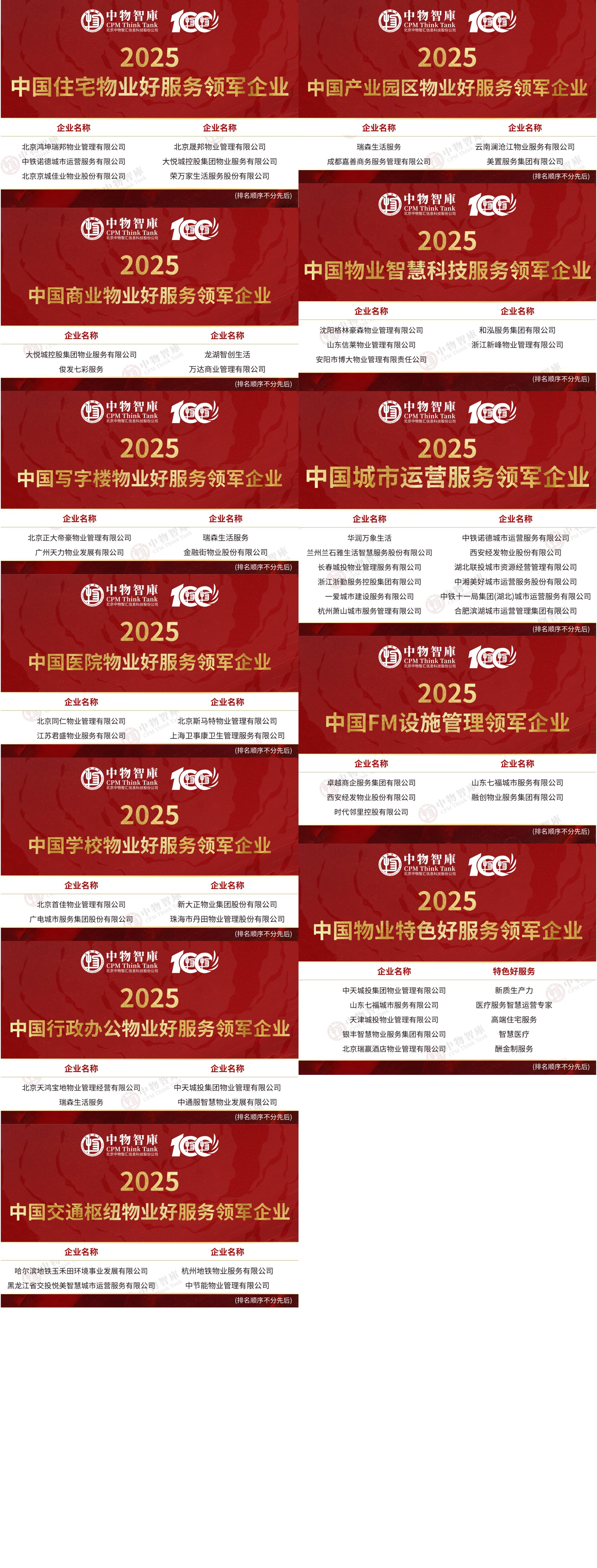 2025年12月2日,中物智库隆重揭晓“2025中国物业高品质服务力百强企业”及系列榜单,“2025,城市住宅/公建十大品牌物业服务企业”各城市研究成果同期发布,共同见证中国物业服务企业基业长青、业绩长虹!