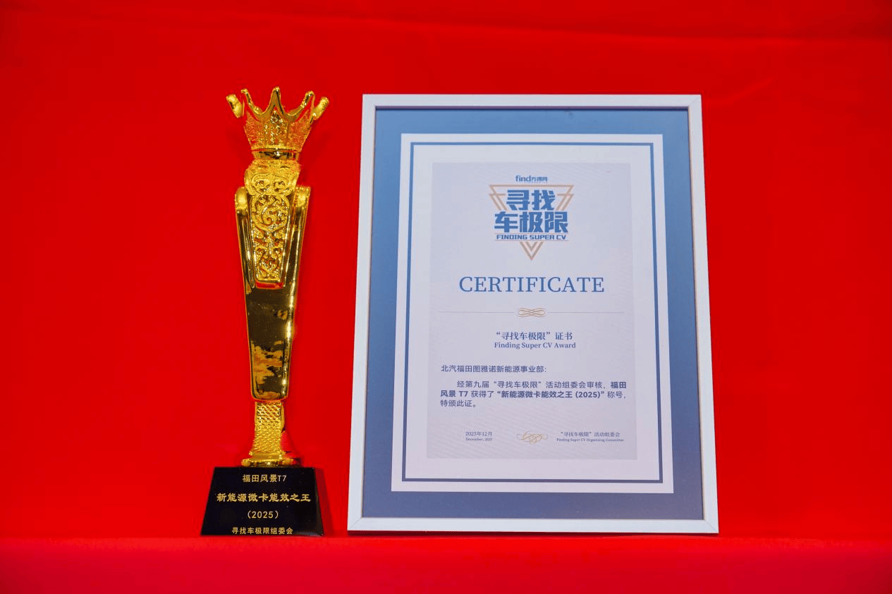 2025年12月10日,在“第九届寻找车极限”活动现场,经组委会专家组专业评审,福田风景T7凭全维度能效优势成功摘得“新能源微卡能效,(2025)”荣誉。这一结果有力印证:当末端物流开启以能效为主的发展新时期,风景T7微卡已为行业树立了新典范。