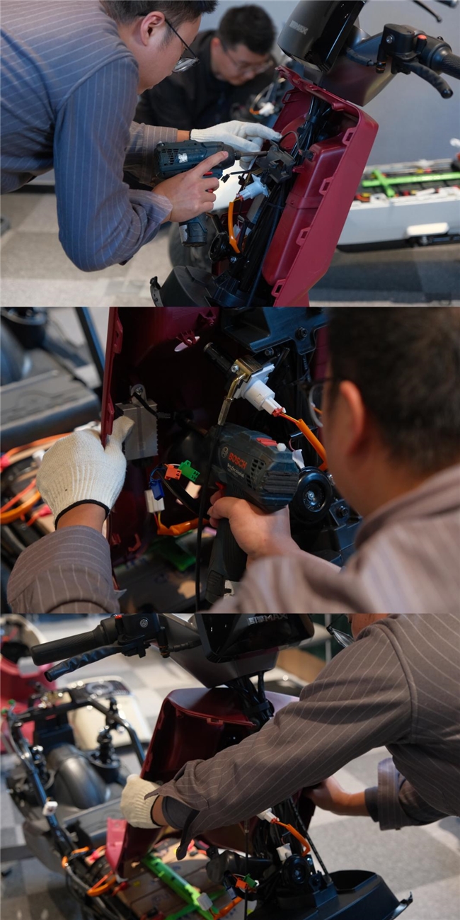拆车环节。通过对于爱玛仰望,的拆解,其内部的高品质细节在与会导购员面前展示无遗,扎实可靠的用料,牢固稳定的焊接,工整有序的电路布线等细节,无不体现了爱玛对品质的严格把控。此举不仅以 “所见即所得”的方式进一步帮助导购员树立了产品信心,更为大家在实际销售工作中回应消费者疑问,详解技术、工艺与品质优势点提供了扎实的依据。