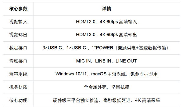1.高效集成性: 将硬件级三平台推流、4K 60fps高清采集、毫秒级低延迟、全接口适配等核心功能集成于小巧的金属机身,一台设备替代多台硬件+复杂软件,大幅降低多平台直播的硬件成本与操作难度;