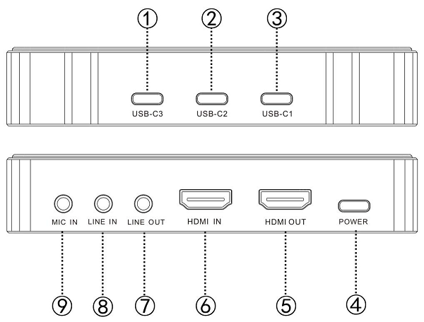 酷嗨米J300采集卡的接口全部分布于机身两侧,布局清晰直观,彻底告别线材缠绕的烦恼。一侧专门设置HDMI输入/输出口,HDMI IN连接相机、手机、游戏机等信号源,HDMI OUT可环出画面供实时监看,让主播随时掌握直播画面状态;音频接口满足麦克风、音响等音频设备的连接需求,POWER连接实时供电。