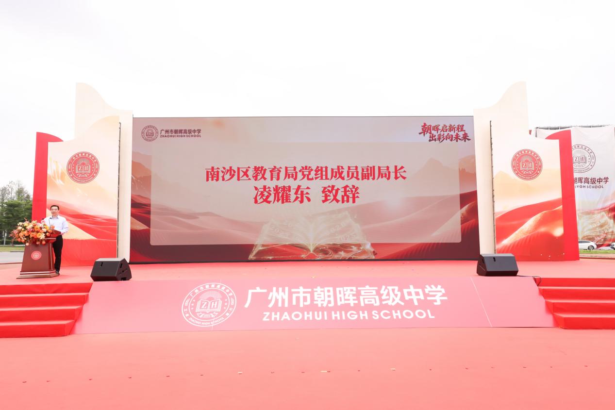 南沙区教育局凌副局长代表区教育局致辞,对广州市朝晖,中学揭牌更名表示热烈祝贺。他指出,南沙始终坚持教育优先发展战略,持续优化教育布局,朝晖,中学的全新启航,是南沙民办教育提质增效的重要成果。他对学校未来发展寄予厚望,希望学校深耕内涵、彰显特色,全体教师潜心育人、匠心执教,广大学子勤学奋进、逐梦成长,区教育局也将全力支持学校发展,助力学校打造区域教育标杆。