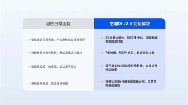 玄瞳DI持续升级,v2.4发版,带来两张“增量地图” :一张覆盖500万+餐饮终端(28类细分),另一张指向50万+特通封闭场景(7类新网点)。