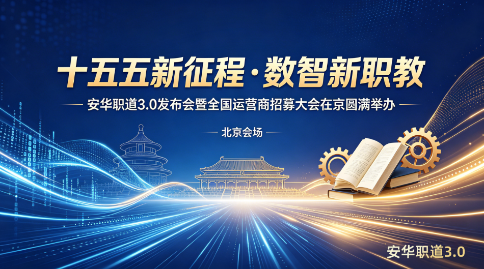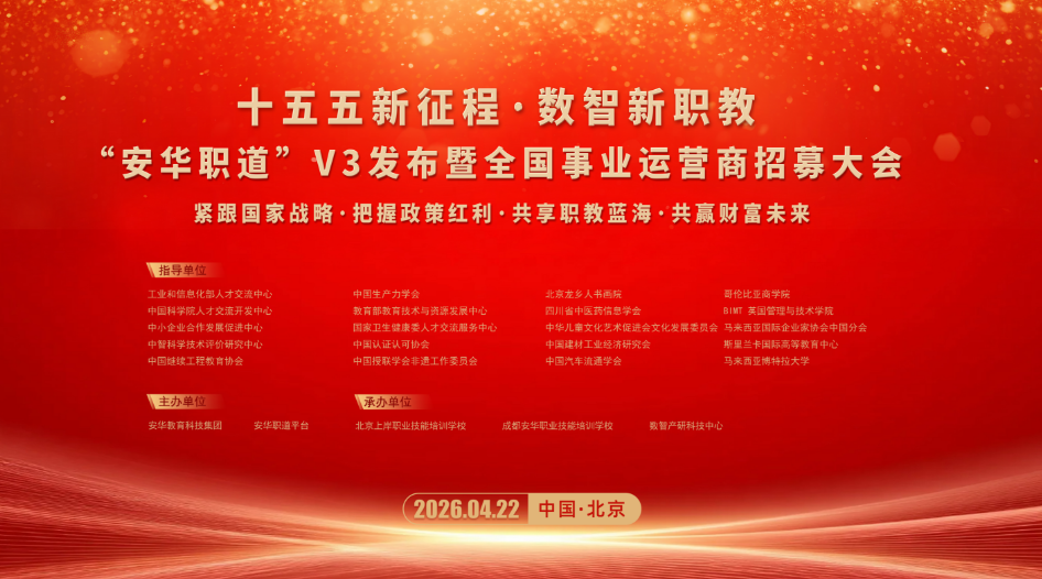 春风浩荡启新程,职教扬帆向未来。2026 年,安华职道 3.0 发布会暨全国事业运营商招募大会 在北京隆重举行。本次大会以 “紧跟国家战略・把握政策红利・共享职教蓝海・共赢财富未来 ” 为核心导向,聚焦 “十五五” 职业教育高质量发展新机遇,正式发布安华职道 3.0 数字化赋能平台,并面向全国启动事业运营商招募,携手各界伙伴共拓万亿职教新蓝海,共筑职业教育发展新生态。