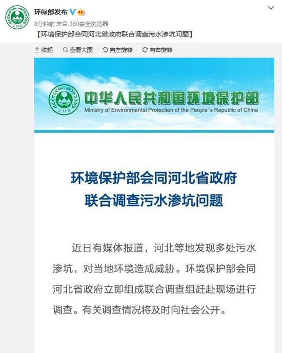 中新网4月19日电 据环境保护部宣传教育司官方微博消息,近日有媒体报道,河北等地发现多处污水渗坑,对当地环境造成威胁。环保部会同河北省政府已成立联合调查组赶赴现场进行调查。