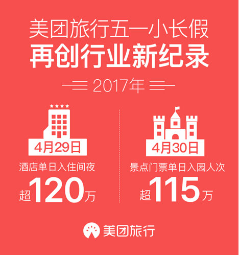 此前,美团点评酒店业务最高单日入住间夜纪录在清明假期创造:2017年4月2日,美团点评住宿业务消费间夜超107万;门票业务最高单日入园人次纪录在春节假期创造:1月31日正月初四,仅景点门票单日交易额就突破1.14亿,当天入园超过106万人次。