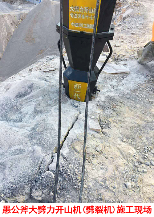 愚公斧大劈力开山机(劈裂机)的原理是以高压油为能量源,由泵站输出的超高压油驱动油缸产生巨大推动力,使岩石膨胀机推动楔器,使劈块向两边扩张,达到接近5000吨的劈裂力,经机械放大后在数十秒内轻而易举地从物体内部将一块巨石分裂,并使物体按预定方向分裂。从而使坚硬而巨大的矿石从山体中分离。