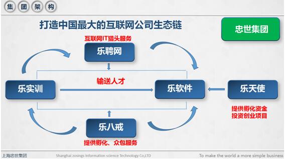 互联网生态链,是“互联网+”中最具内涵的名词之一,而打造互联网生态链似乎是忠世集团与生俱来的使命,其旗下拥有的乐软件是专业软件开发公司,忠世集团·乐聘网是专业的猎头公司,忠世集团·乐实训是专业的IT实训公司,以及忠世集团·乐八戒是专业的众包公司,忠世集团是一个健康的闭环生态链,是中国最大的互联网生态链之一。