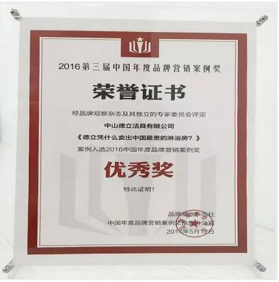 日前,2017首届中国品牌50人论坛在广州香格里拉隆重召开,这是由品牌观察主办的中国营销届“奥斯卡”。在此次大会上,主办方从中国品牌价值500强的企业中,评选出2016年度第三届中国年度品牌营销案例奖,其中德立淋浴房凭借极致的品质、全新升级的品牌形象,从众多优秀企业中脱颖而出,荣获淋浴房行业优秀奖。