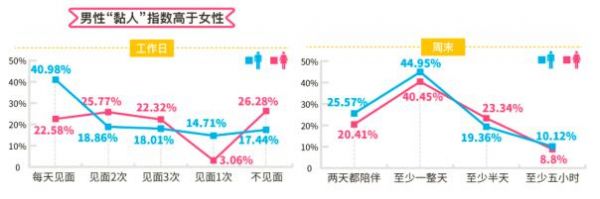 千万别以为对待恋爱,黏人的总是小鸟依人的女性。报告显示,男性的“黏人”指数就高于女性。有40.8%的男性工作日期间希望与伴侣每天都见,但女性显然不愿意将工作日的休闲时间花在约会上,有26.78%女性更喜欢“周末约见”模式。