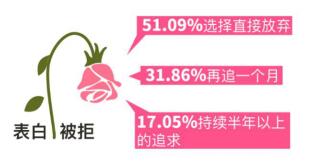 而一旦表白被拒,51.09%的男女会选择直接放弃,仍有31.86%的人愿意花一个月的时间争取机会,仅有17.05%的人会选择半年以上用坚持感动对方。