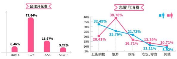 恋爱的甜蜜时光,各项花费自是少不了。调查显示, 72.64%的单身男女认为恋爱月花费1-2k是合理的,花费占比工资收入的四分之一。就消费而言,32.6%的男性认为逛街购物为恋爱花费中最大开支,将女性钟爱的“买买买”视作钱包的头号大敌,其次为旅游和娱乐;而女性则认为旅游为最大开支,其次为逛街购物和娱乐。