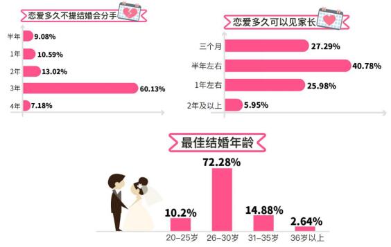 婚姻有7年之痒,恋爱则有3年之坎。调查显示,近六成的男女认为恋爱3年都不提结婚就会面临分手危机,超过9成的男女认为,恋爱一年或者更短时间即可安排见家长。尽管如今大龄单身的趋势愈来愈强,七成单身男女依然认为26-30岁的年龄区间才是最佳结婚年龄。
