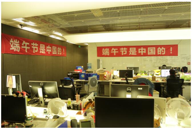 端午节前夕,上海一家企业把捍卫中华传统文化写入了企业文化,在公司打出两幅横幅:“端午节是中国!”号召员工牢记“端午节的起源,不要被韩国文化所影响”。此举被员工拍照后流传至网上并引发热议。有网友认为这家企业很有民族使命感,端午节归属中韩两国一直有争议,这话“很提气“;也有网友看了乱入画面的“脑白金”,调侃称”脑白金必须也是中国的!“。