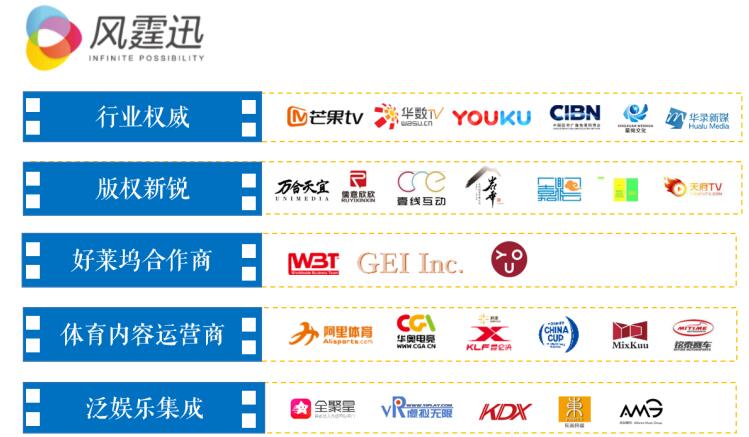 在内容整合方面,风霆迅是唯一拥有众多版权方正版片源的集成运营商。影视内容达6,000余部,娱乐资源近90,000集,不仅与芒果TV、华数TV、优酷、华录、星绚、CIBN、儒意欣欣、万合天宜等重量级版权平台和国内知名电影制作机构达成版权合作,同时与来自好莱坞的WBT、GEI等版权运营商共同创建好莱坞独家影视内容引进模式(今年将引进100部独家好莱坞影片),构建了海量正版内容库,为点播影院门店提供可天天更新的正版片源,并与中视体育、昆仑决、铭泰赛车、阿里体育、合纵音乐等公司达成合作,引入泛娱乐内容。