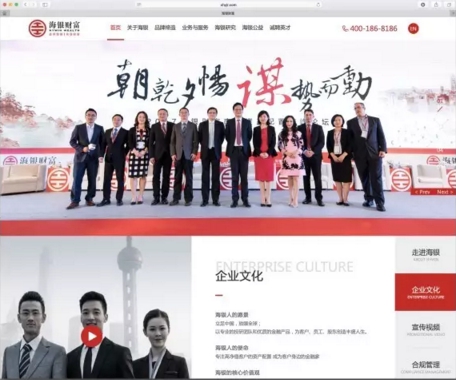 相比海银财富旧版官网,海银财富新官网的版块划分更清晰简洁明了,首页的二级目录中分为“关于海银”、“品牌缔造”、“业务与服务”、“海银研究”、“海银公益”和“诚聘英才”,全面展示海银财富的发展历程、企业文化、宣传视频、荣誉奖项、媒体报道、海银事记、海银动态、品牌峰会、投研报告和公益活动等企业风貌。为大家展现一个全面的、有血有肉的财富管理公司。