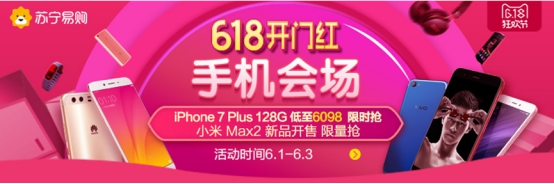 据悉,6月1日—20日期间,苏宁易购手机品类小米5c1499元,购机即享六期免息及充电宝、耳机等好礼;小米6新品限时抢购2499元起;华为Nova2 2499元,预约即赠乐心手环;三星Galaxy S8 5688元每日限量抢购。