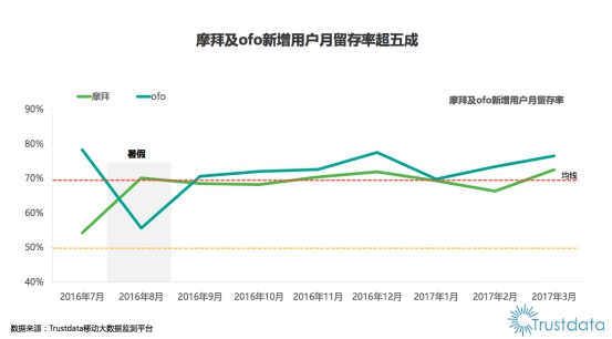 最新数据也显示,自去年9月进入城市后,ofo新增用户的月留存率始终高于行业70%的平均水平,且连续7个月超越摩拜的新增用户月留存率。