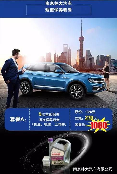 A类优惠套餐:预存1080元即可享受价值1350元的5次常规保养,每次保养包含(机油、机滤、工时费)。