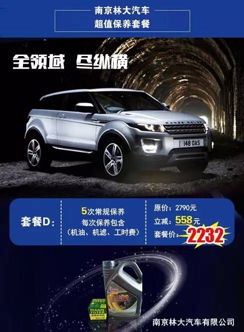D类优惠套餐:预存2232元即可享受价值2790元的5次常规保养,每次保养包含(机油、机滤、工时费)。