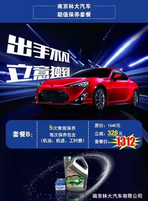B类优惠套餐:预存1312元即可享受价值l640元的5次常规保养,每次保养包含(机油、机滤、工时费)。
