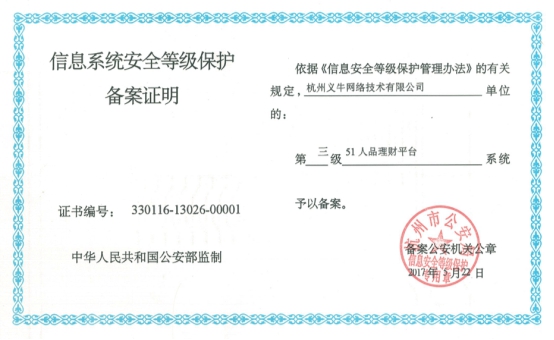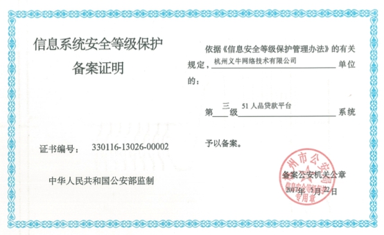 此次,“51人品”的理财系统和贷款系统均接受了第三方测评公司对于平台物理安全、网络安全、主机安全、应用安全、数据安全及备份恢复、安全管理制度、安全管理机构、人员安全管理、系统建设管理、系统运维管理等全方位的安全测评,获得高分通过,并经由公安部门严格审核后下发了两份备案证明。