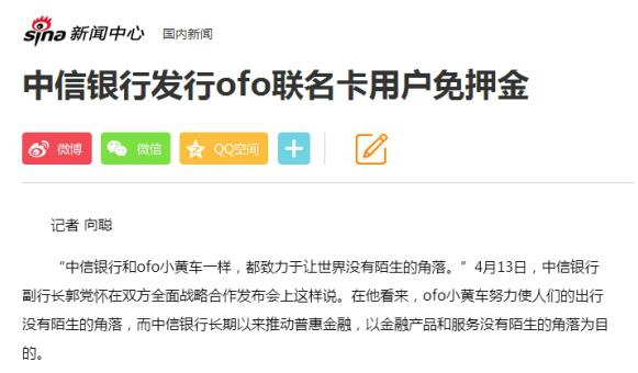 除了与支付宝进行信用合作之外,ofo还与金融机构进行了“信用解锁”的尝试。例如在今年4月,ofo联合中信银行推出了ofo联名信用卡,持有此卡的用户可以免去99元押金。与其它玩家拉上支付宝全国免押的玩法不同,ofo小黄车在信用骑行领域深入耕耘,运营更加精细化。