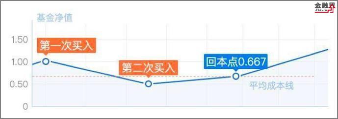 同样1000元,买1元净值的基金只能买1000份,当跌到0.5元时,却能买2000份。当1元和0.5元定投的份额合计时,计算出的平均定投成本是0.667元,在这个低成本下,底部反弹33%就能保本了。