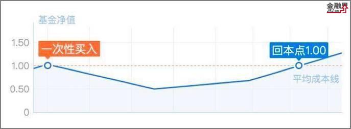 而如果是一次性购买2000元基金,由于每份基金平均成本是1元,在同样的市场情景中,需要底部反弹100%才能保本。