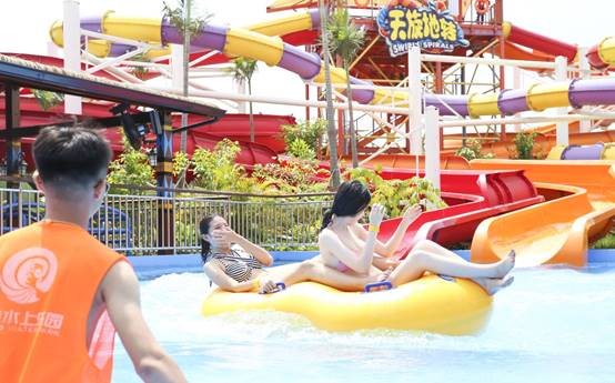 与园区环境里神秘悠远的东南亚建筑不同,方特水上乐园大部分的游玩项目可谓是极具现代感,鲜明的色彩和夸张的造型富有强烈的视觉冲击力。水上极限项目风驰极限由紫色变坡滑道、蓝白色高速螺旋滑道、蓝色高速滑道三条滑道组成:紫色变坡滑道两段式变速;蓝白色高速螺旋滑道旋转扭曲,体验强大的离心冲击;更有专为勇敢者设计的蓝色高速滑道,从近六层楼高的平台上以每秒7米的速度紧贴着几近垂直的滑行面下冲,极限刺激,让游客体验心跳加速水花飞溅的感觉。针对合家出游的群体,方特水上乐园也有诸如水上梦工厂,彩虹滑道,飓风湾等温情悠闲项目可供选择。值得一提的是,飓风湾是拥有超大水域面积、造浪极高的“真空造浪池”,1.5米的连续海浪和3米的大海啸巨浪从不同方向冲击水岸,海浪波涛汹涌,将阵阵清凉席卷而来。